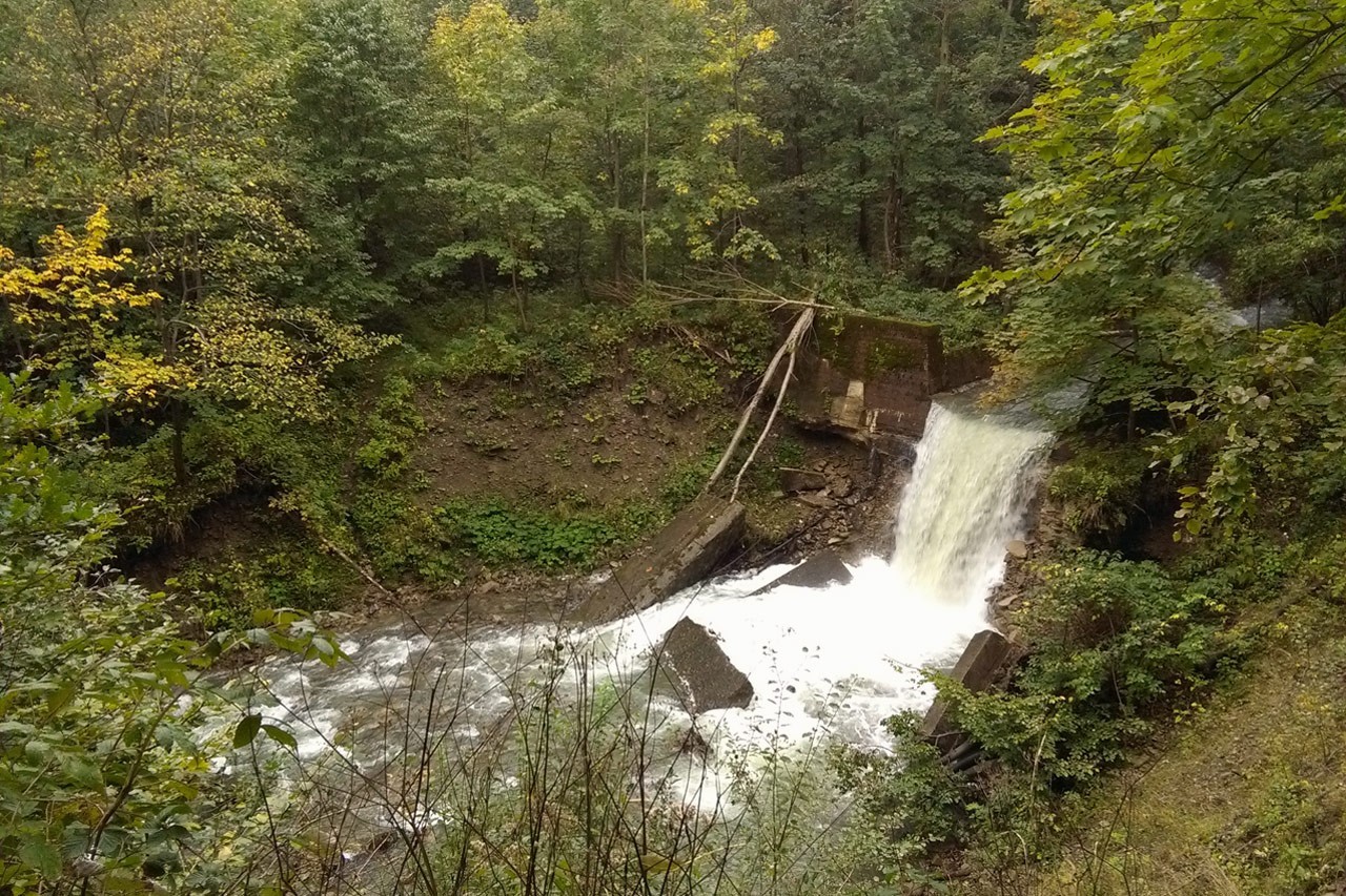 Zdjęcie przedstawia huczący i pieniący się wodospad na potoku Wapienica.